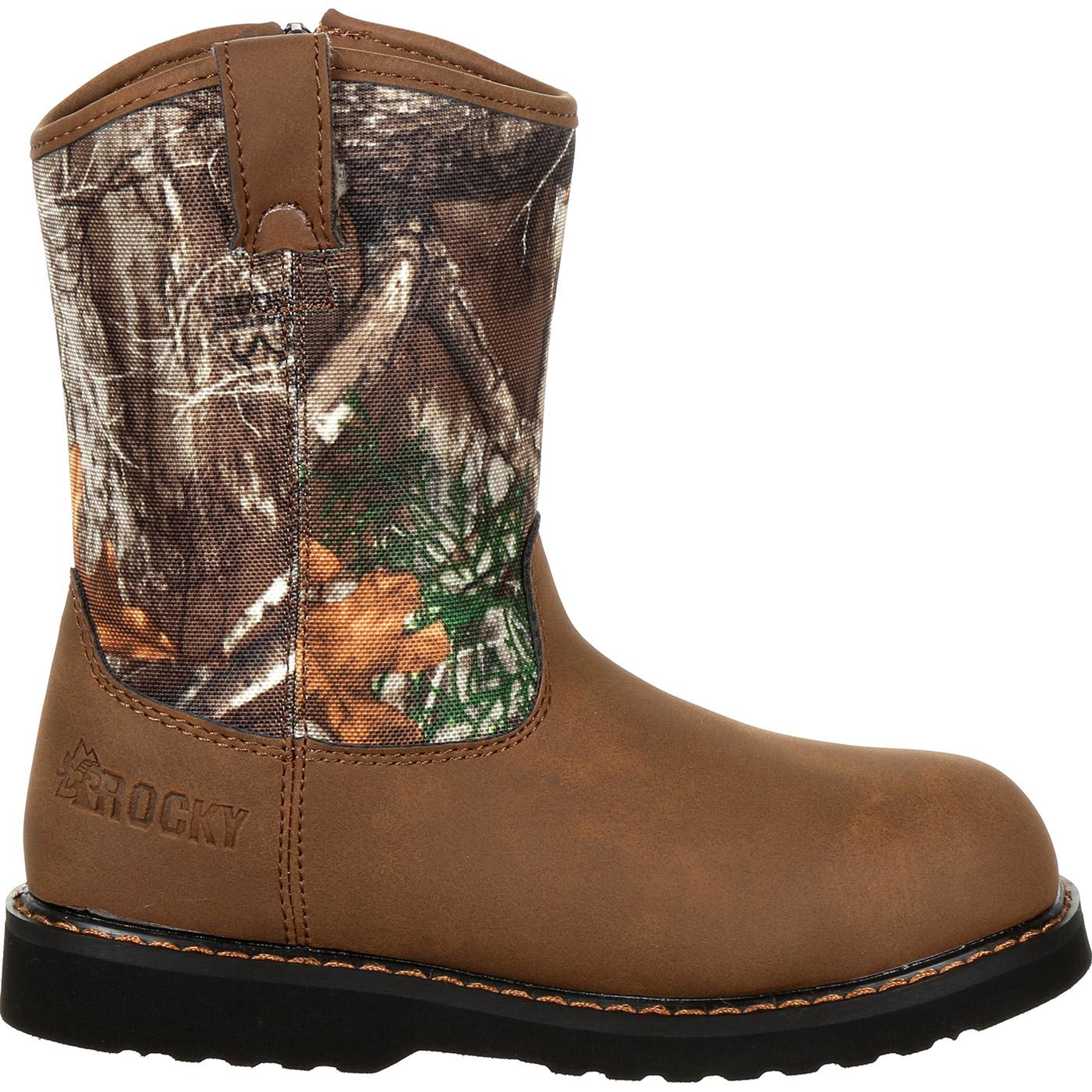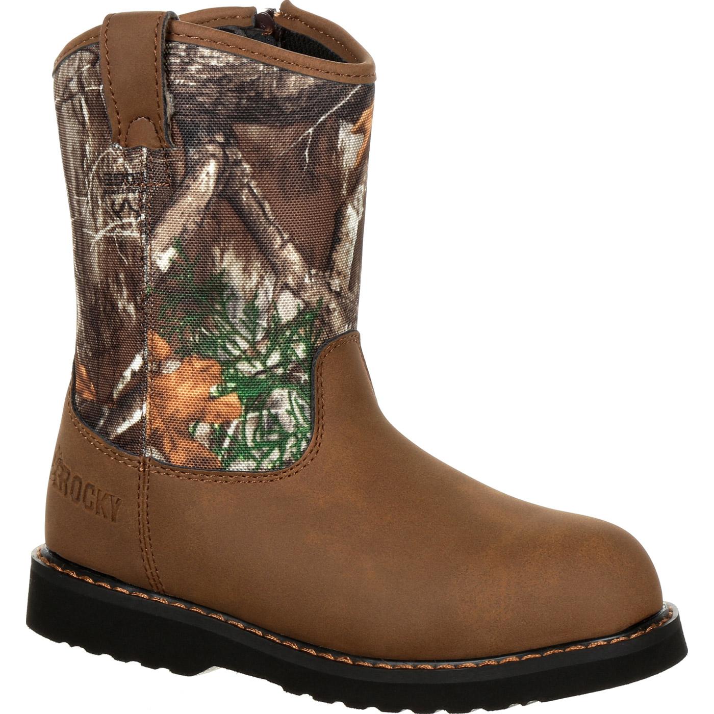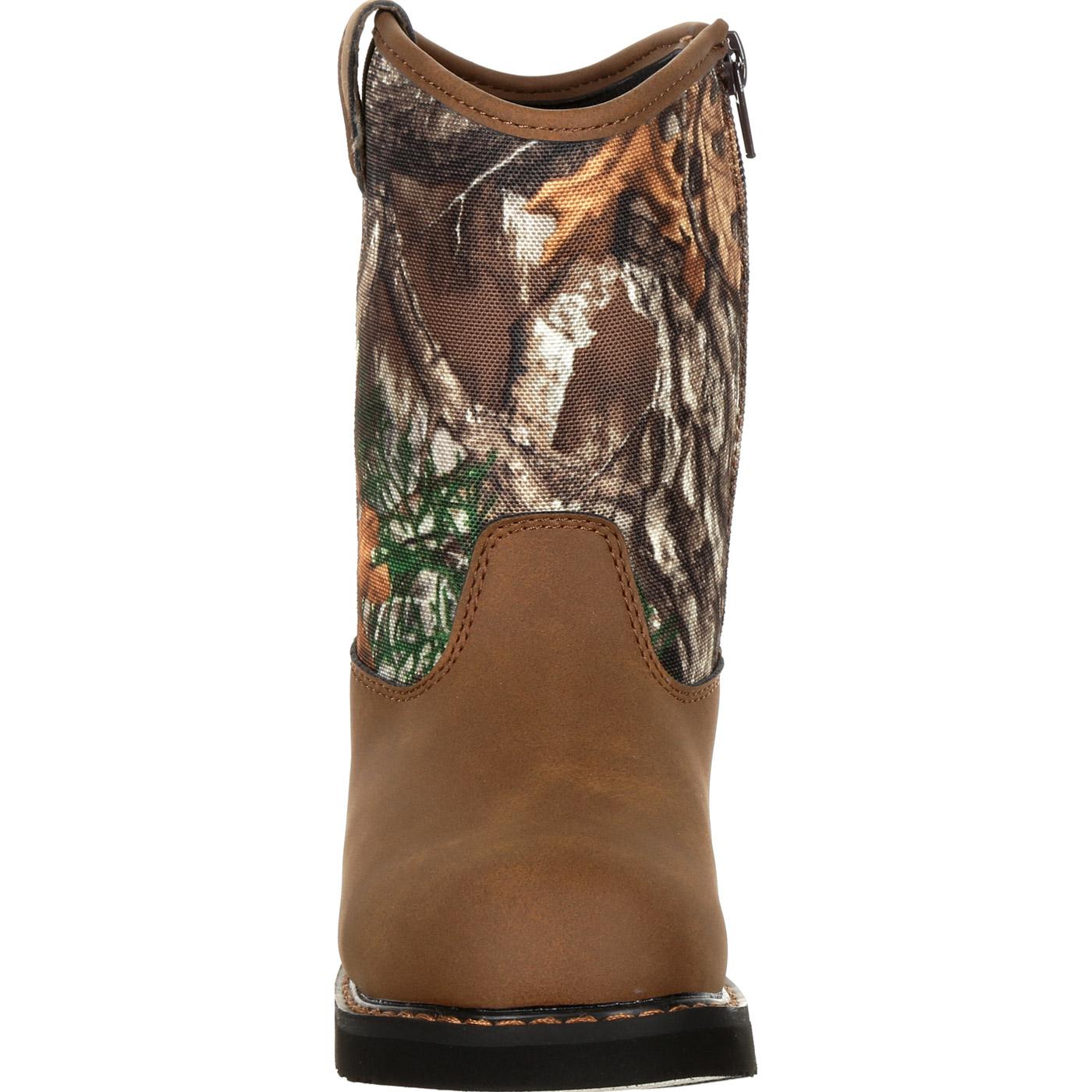 Do you have a lil’ buckaroo in the family? Well these boots were made just for them. With an easy-on and off side zipper. a cushion outsole design. and 900 denier nylon upper these Realtree Edge boots will make your little one proud to walk around the farm. or around town. with mom & dad.