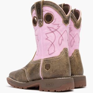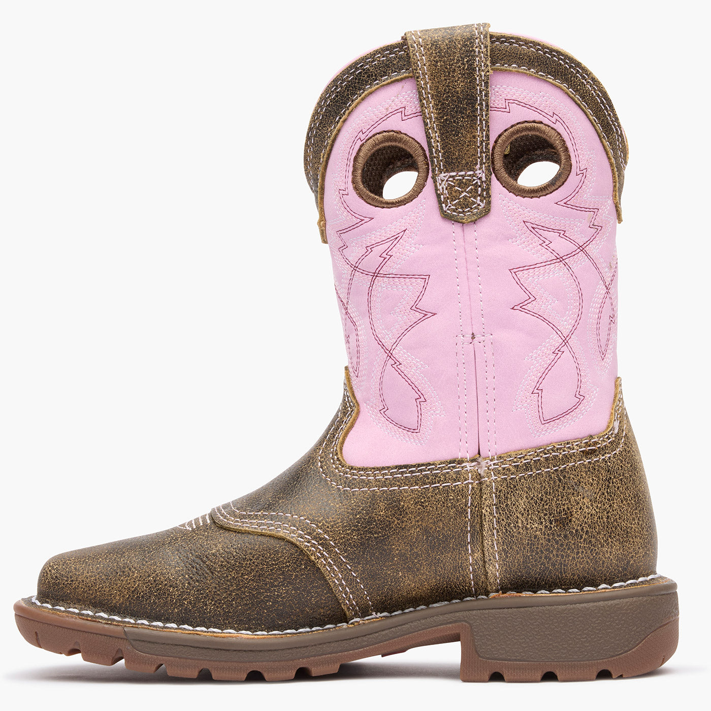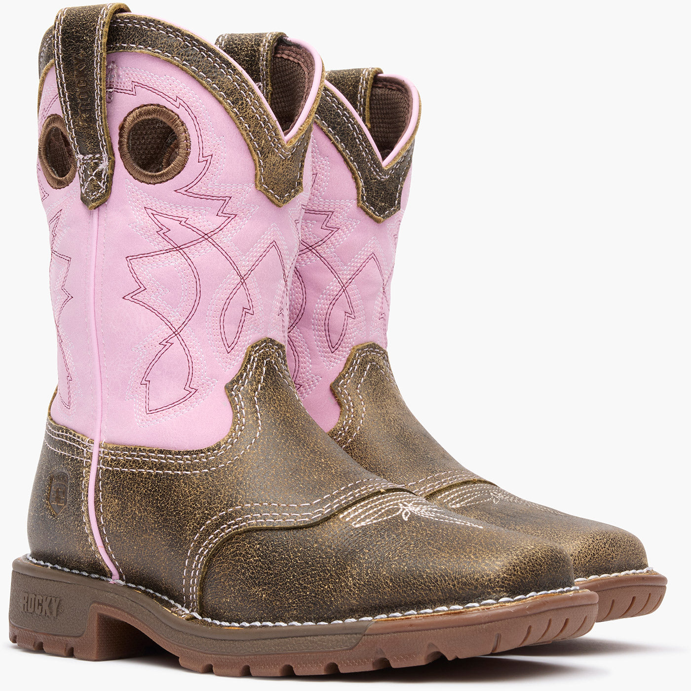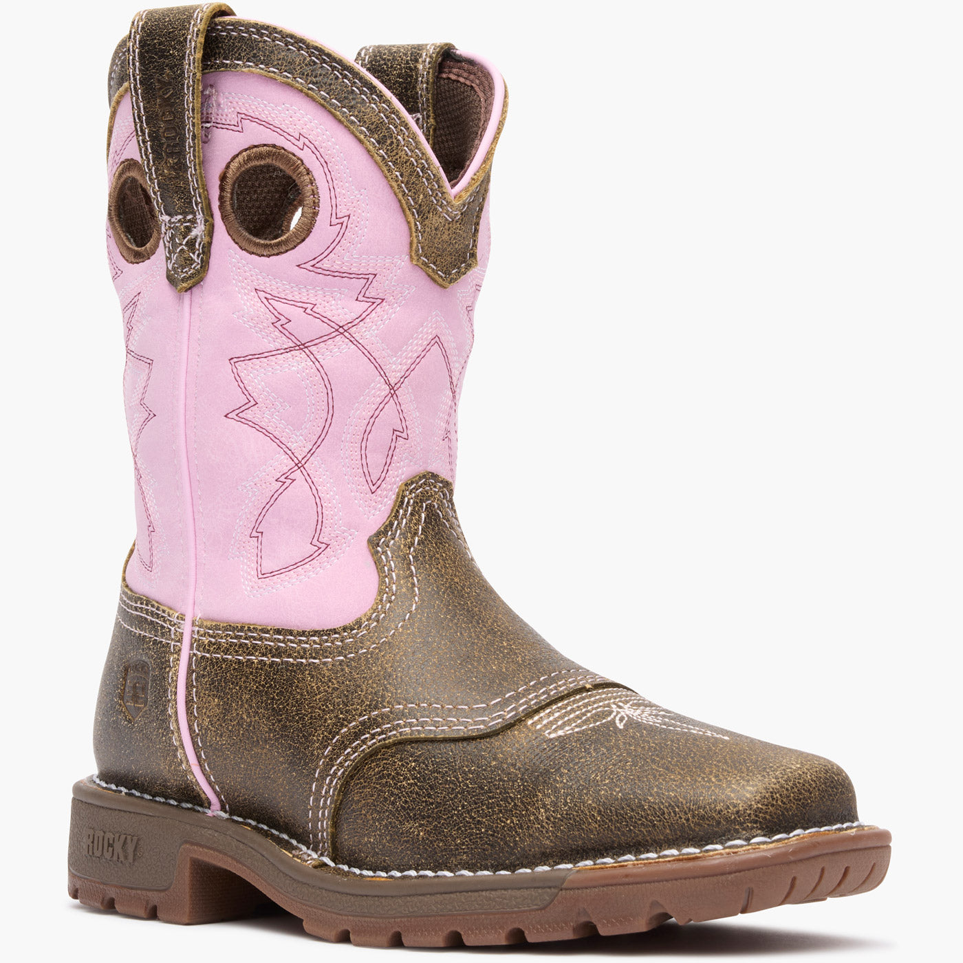 The Rocky Little Kid’s Legacy 32 Western Boot delivers great western style at a great value. This Brown & Pink 8-inch boot is made with a full-grain leather foot and a man-made shaft. The square toe boot features and expansion fit seam for easy on and off. while their flexible construction and cushioned insoles keep little feet comfortable all day long.