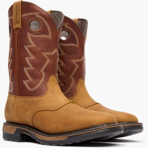 These 11-inch men’s western work boots have full-grain leather uppers. The foot is tan paired with an ochre shaft that features stitching detail. The boot has both pull straps and pull loops. as well as a great western square toe.