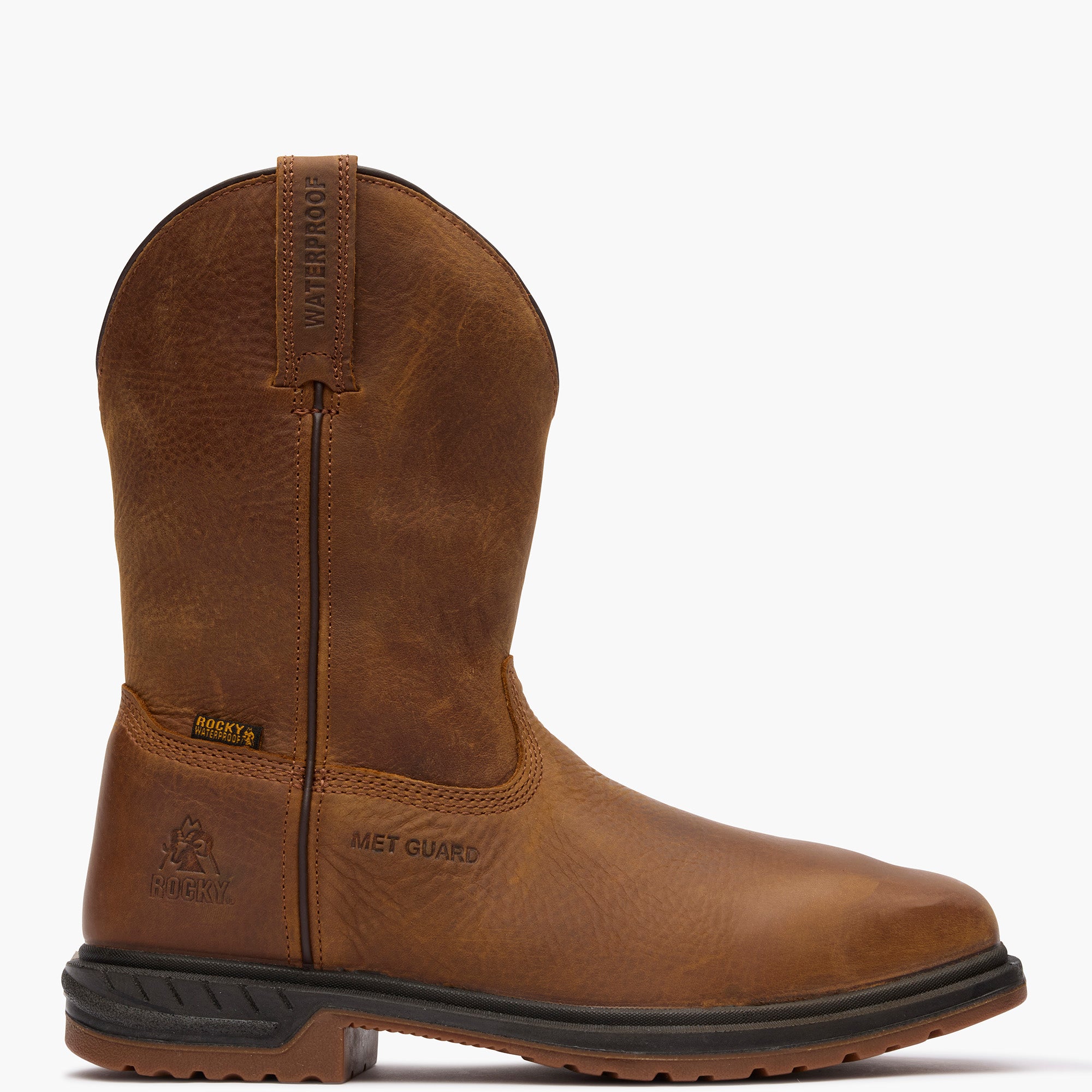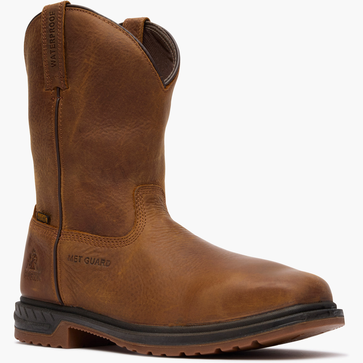 Ready to take on the day. these rugged composite toe work western boots with an internal MET guard are prepared for anything. Tackle any job with full-grain waterproof SPR leather and a tough direct-attached rubber and polyurethane outsole that is oil. slip. and abrasion resisting.
